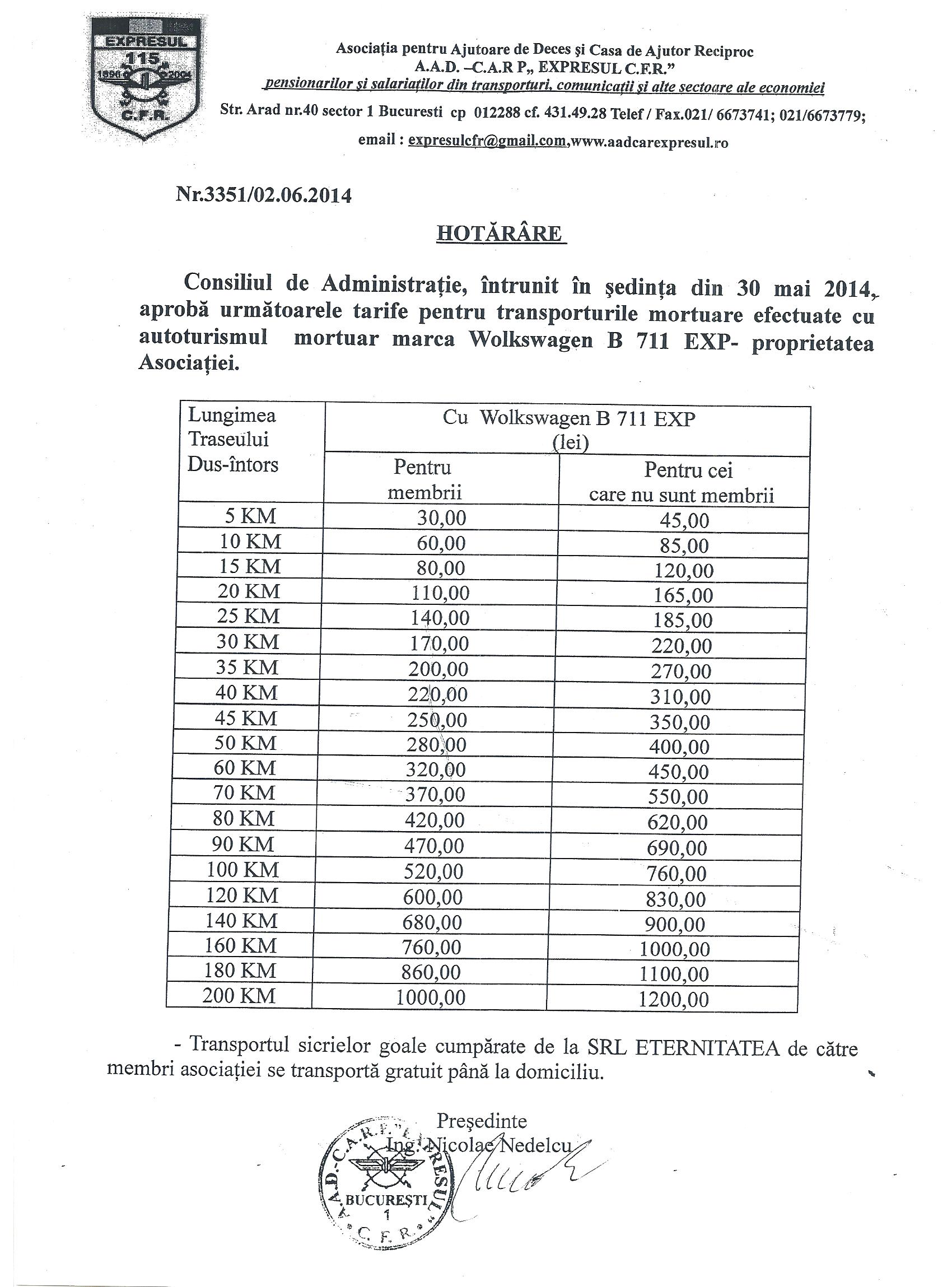 Tarife pentru transporturile mortuare efectuate cu autoturismul mortuar